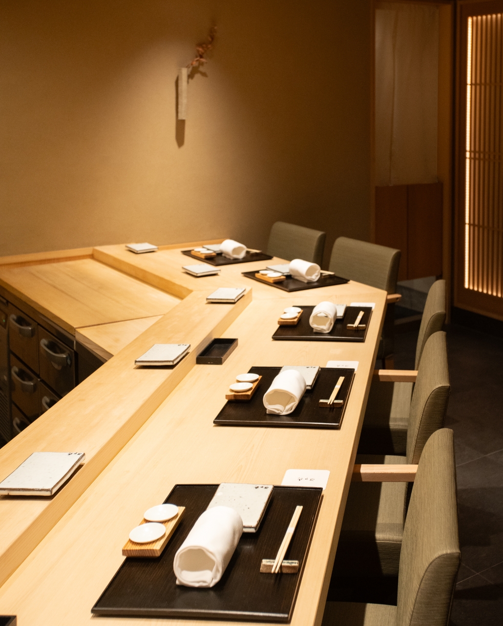 おみ乃 椿は、路地裏の地下にひっそりとある、カウンター7席のみのプライベートな雰囲気が特徴。目の前の焼き場から伝わる、じりじりと鶏の焼ける音と芳ばしい匂いが食欲をそそります。まず、目で味わい、香りを楽しみ、舌で満たされる格別な時間。五感を通じて、鶏本来のおいしさに親しめる贅沢さ。ここでは、他のおみ乃にはない稀有な味わいとの出会いも提供していきます。